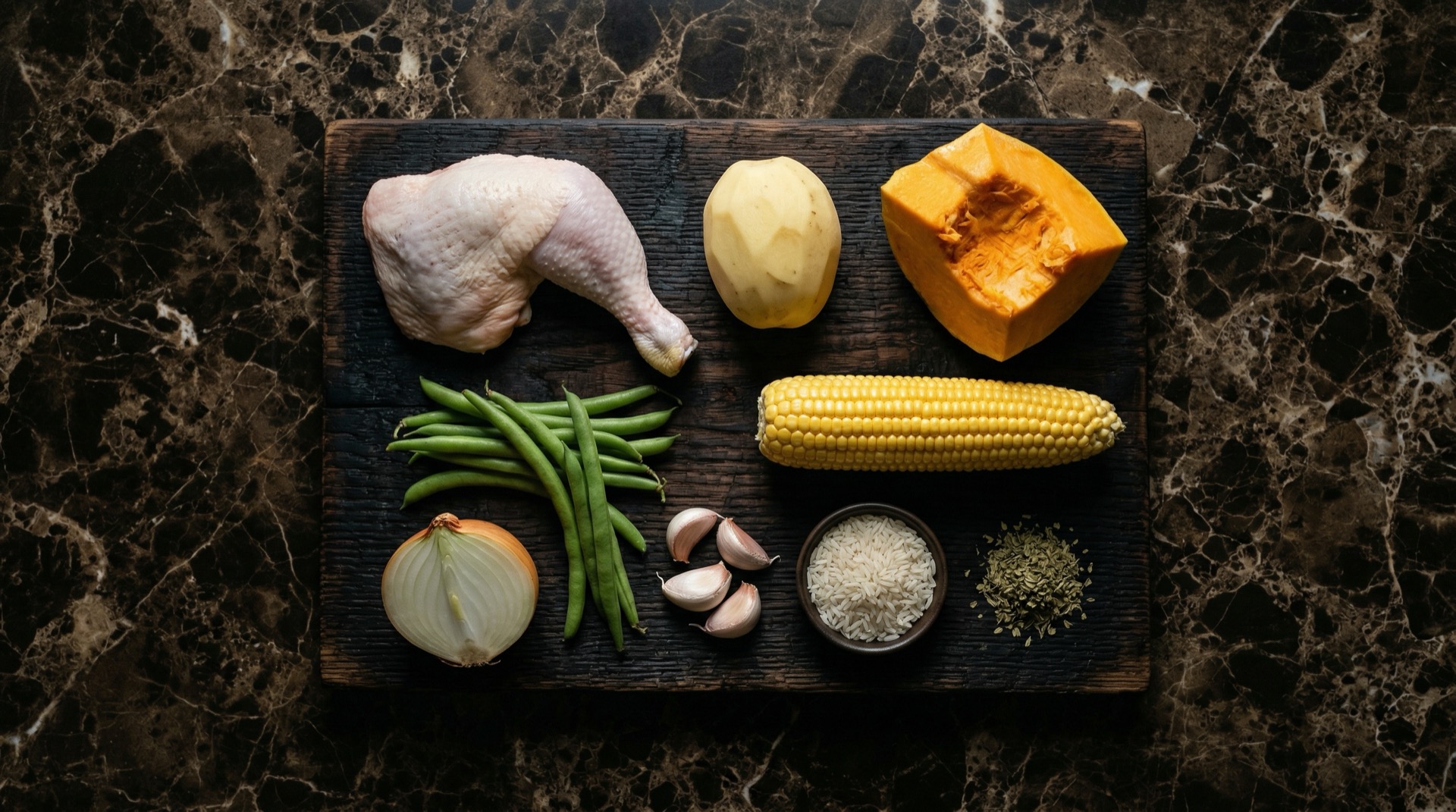 Estos son los ingredientes para preparar cazuela de pollo chilena tradicional.