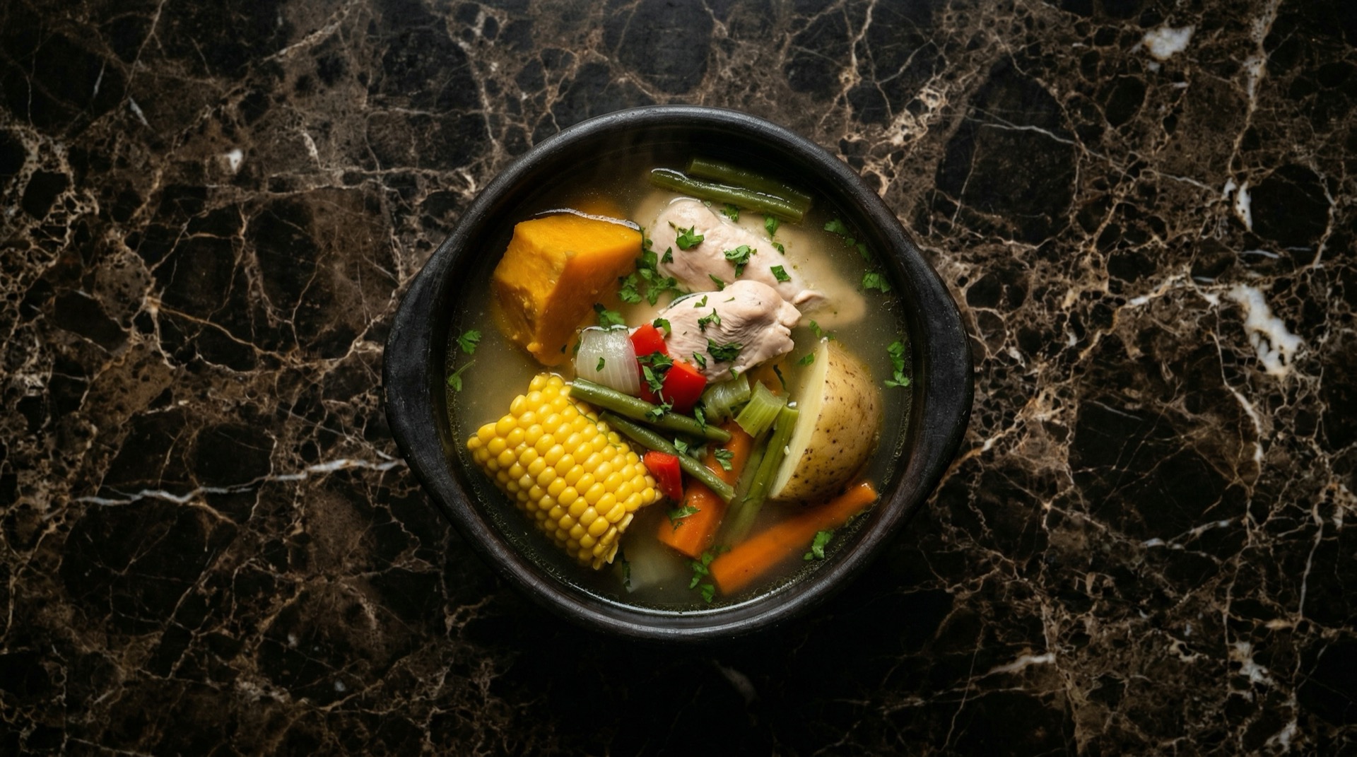 Sirve en platos hondos de greda si los tienes. Cada plato lleva una presa de pollo, una papa, un trozo de zapallo, un trozo de choclo, porotos verdes y abundante caldo caliente. Corona con cilantro fresco picado.