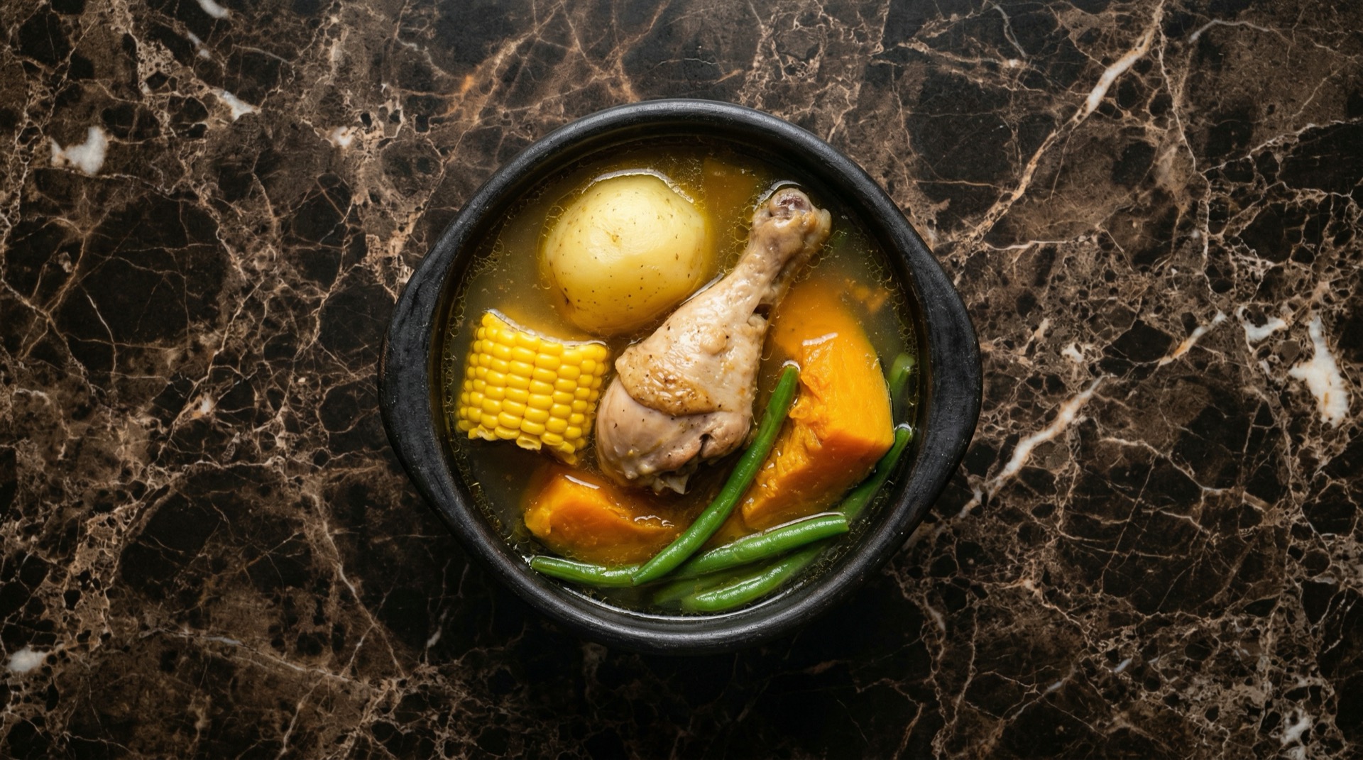 La cazuela de pollo es el plato de cuchara mas emblematico de Chile. Es un caldo claro y aromatico que lleva una presa de pollo (trutro, pechuga o ala), una papa entera, un trozo de zapallo camote, un trozo de choclo, porotos verdes y arroz o fideos cabello de angel. Cada ingrediente se cocina en la olla y se sirve en un plato hondo formando un paisaje comestible.