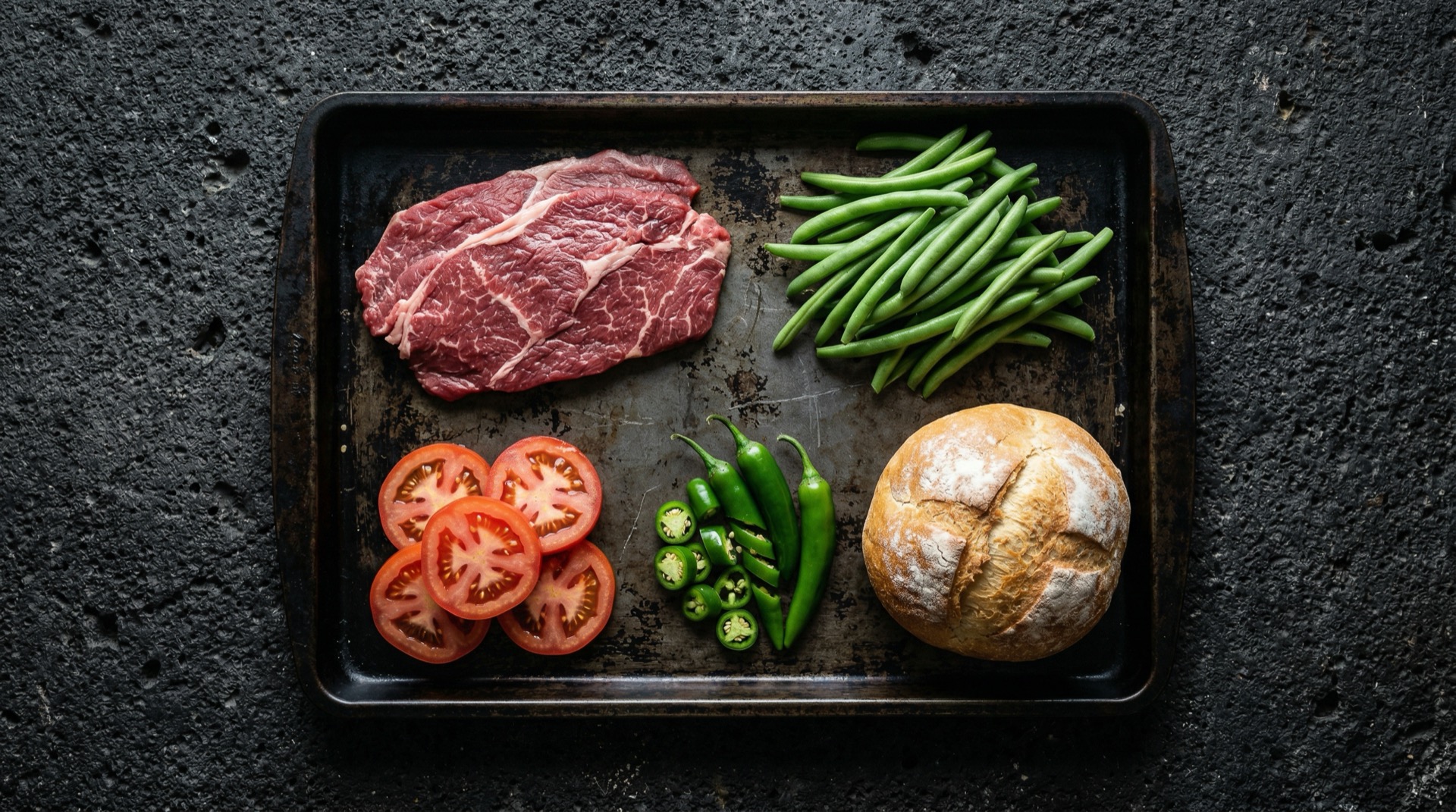 Los ingredientes del chacarero: carne, porotos verdes, tomate, aji verde y pan frica