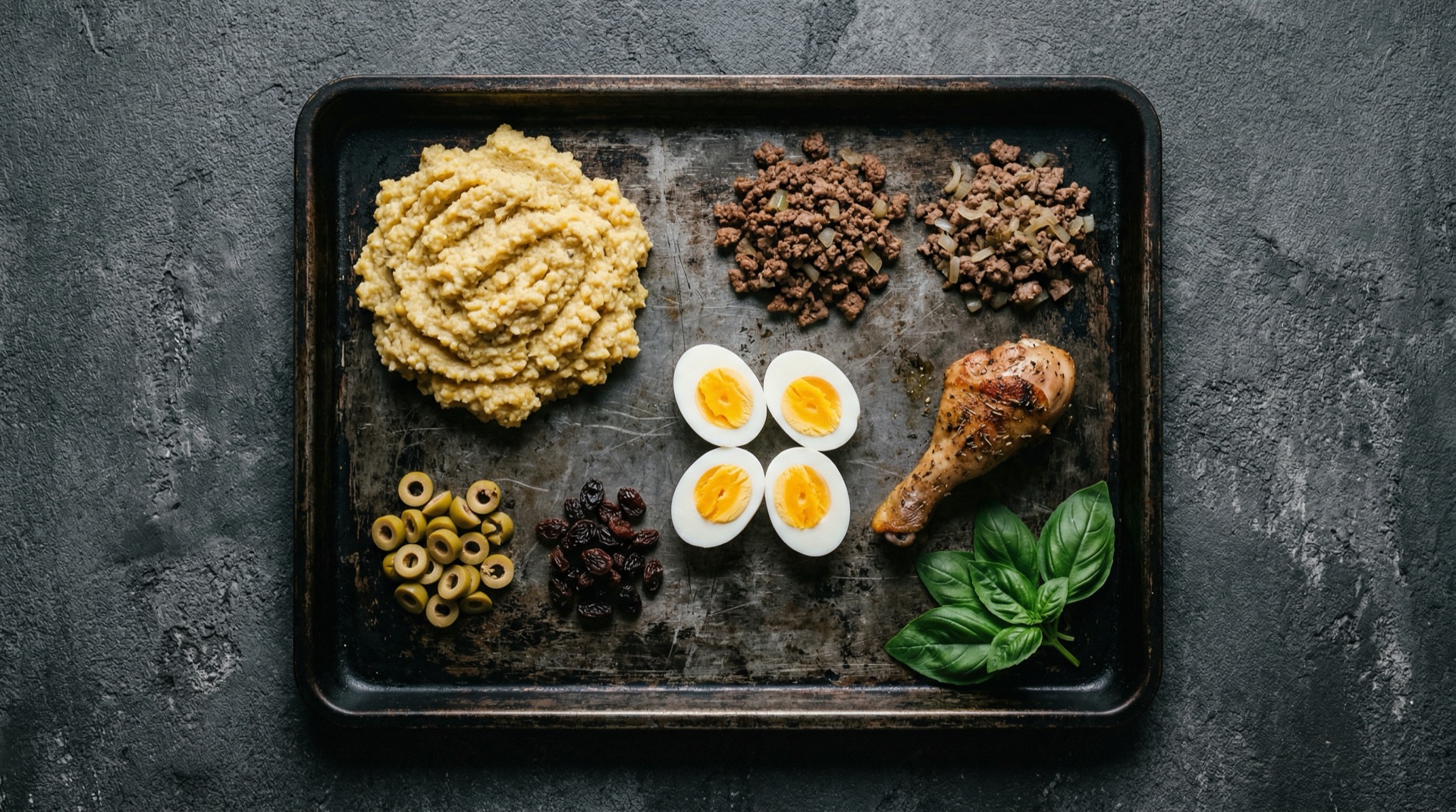 Sobre el pino, distribuye las aceitunas negras, pasas, cuartos de huevo duro y las presas de pollo cocidas. Cada paila debe tener al menos una aceituna, unas pasas y un trozo de pollo.