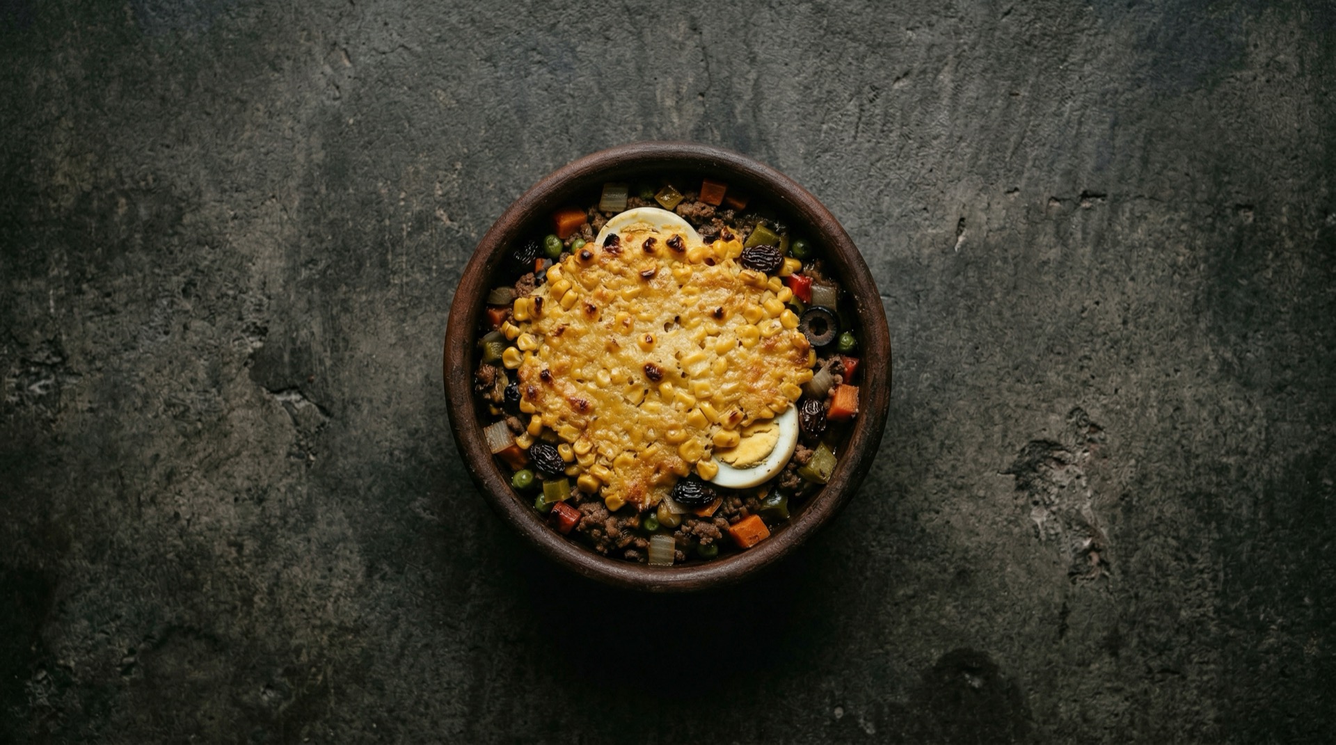 El pastel de choclo es probablemente el plato mas emblematico de la cocina chilena. Es un gratinado hecho con dos capas: una base de pino (guiso de carne molida con cebolla, aceitunas, pasas, huevo duro y trozos de pollo) cubierta por una gruesa capa de pasta de choclo (maiz molido cocido con mantequilla, leche y albahaca) que se hornea hasta formar una costra dorada irresistible.