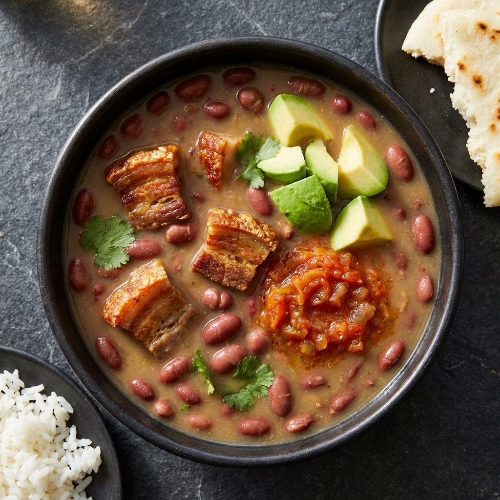 La cazuela de frijoles es el plato del dia a dia en Colombia, especialmente en la region andina y Antioquia. Son frijoles rojos (o cargamanto) cocinados lentamente con hogao (sofrito de cebolla, ajo y tomate), zanahoria rallada y platano verde rallado como espesante natural, hasta lograr una consistencia cremosa y sustanciosa.