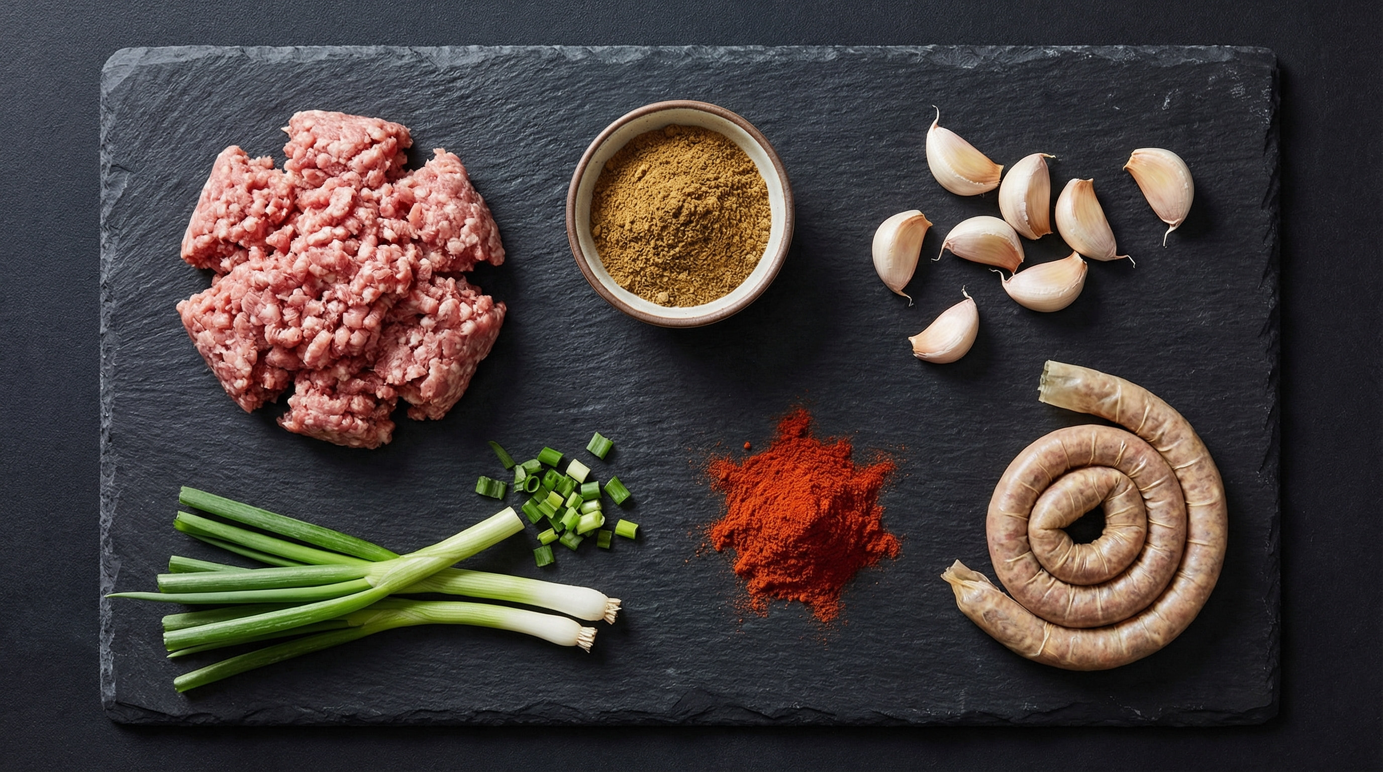 Estos son los ingredientes para preparar chorizos colombianos artesanales.