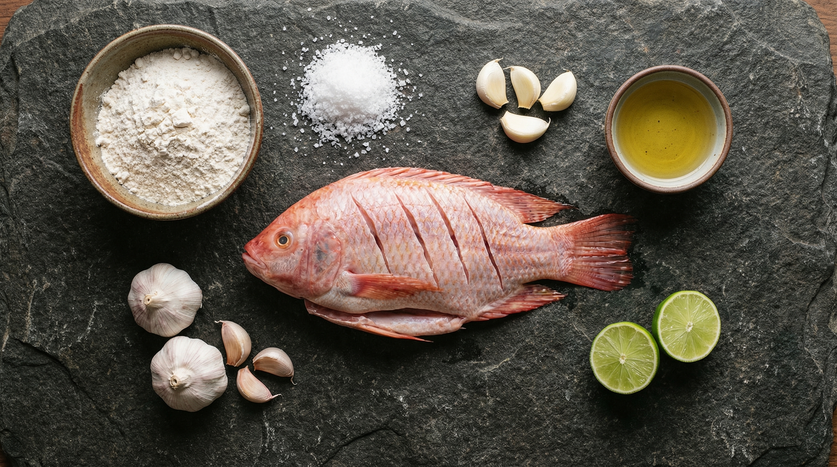 Los ingredientes de la mojarra frita colombiana: mojarra roja, limon, ajo, comino y los acompañamientos clasicos