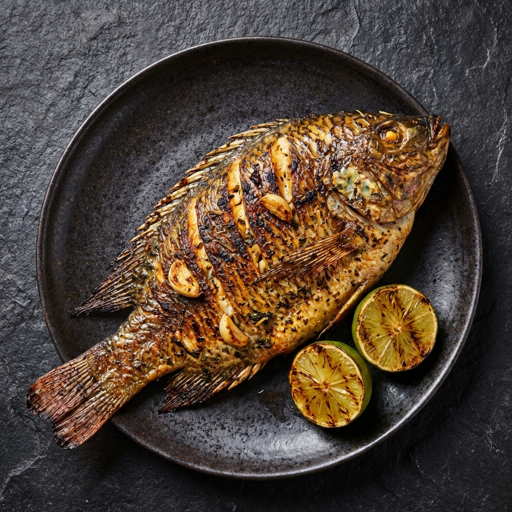 Prepara el adobo mezclando el jugo de 2 limones, los dientes de ajo machacados, el comino, la sal y la pimienta. Frota esta mezcla por toda la mojarra, incluyendo el interior y los cortes. Deja marinar al menos 15 minutos en la nevera.