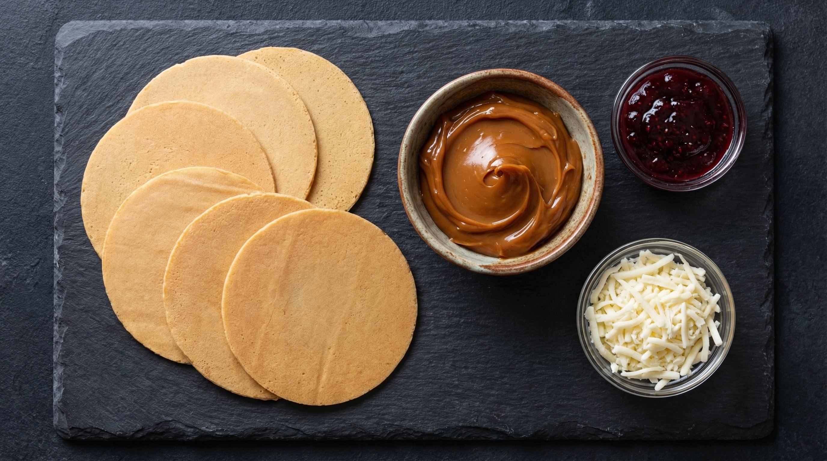 Los ingredientes clasicos de las obleas colombianas: galletas, arequipe, coco, mora y queso