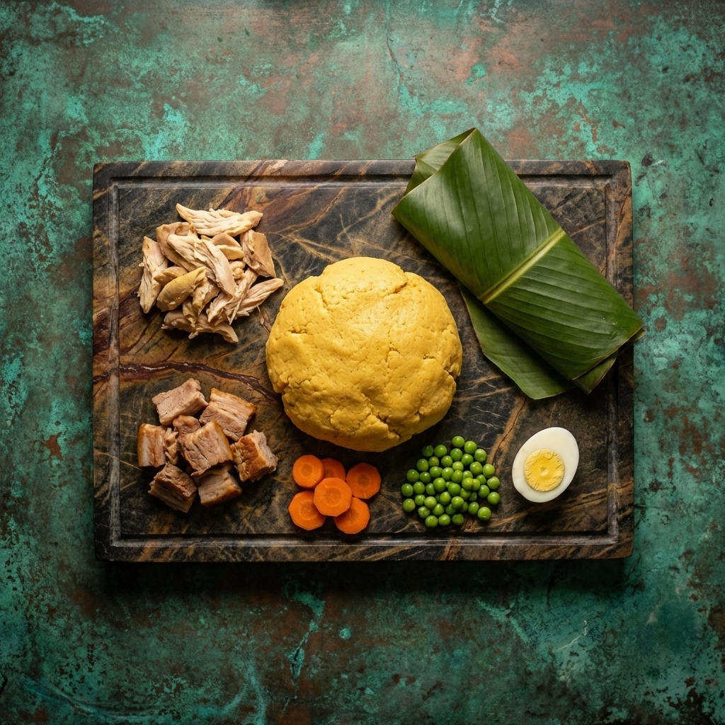 Los ingredientes del tamal tolimense: masa, carnes, verduras y hojas de platano