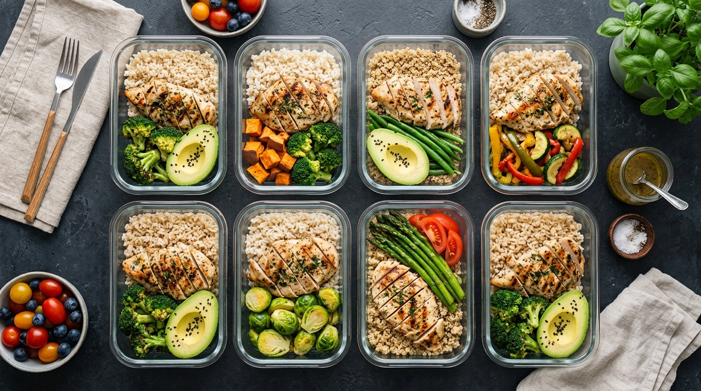 Pechuga de pollo a la plancha (150g) con arroz integral (3/4 taza cocido), ensalada de tomate y pepino, y 1 cucharada de aceite de oliva